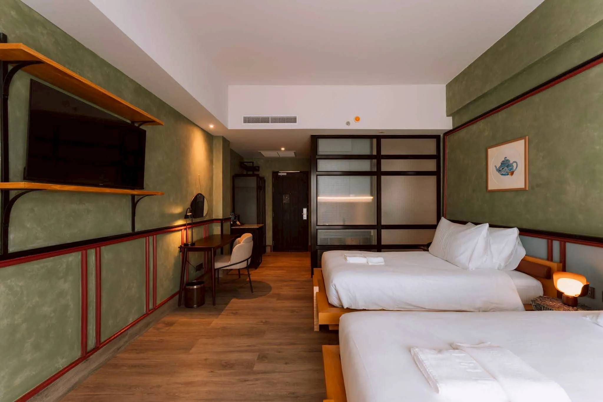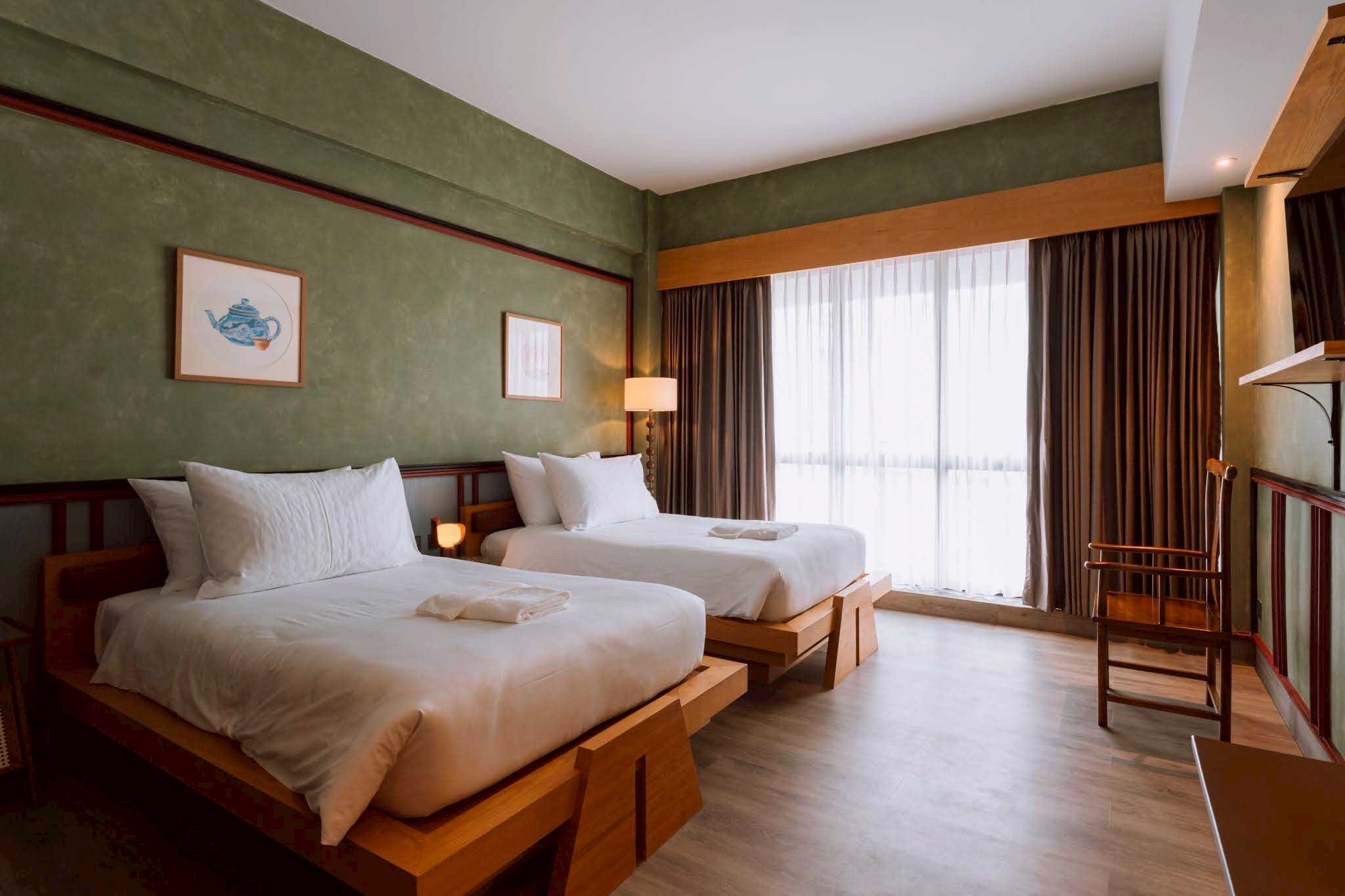 Each twin bed is thoughtfully designed for comfort and rest. Includes work desk, rain shower, and complimentary minibar.